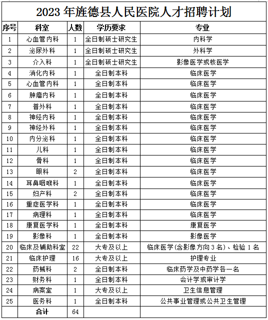 2023-01-06 15:26:28阅读()旌德县人民医院为满足医院发展需要,加强人才队伍建设,按照公开、平等、竞争、择优的原则,面向社会公开招聘工作人员,具体招聘事宜如下:
