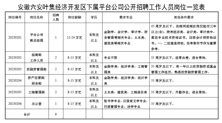 根据工作需要,安徽六安叶集经济开发区下属平台公司(国有企业)现拟面向社会公开招聘9名工作人员,现就有关事项公告如下: