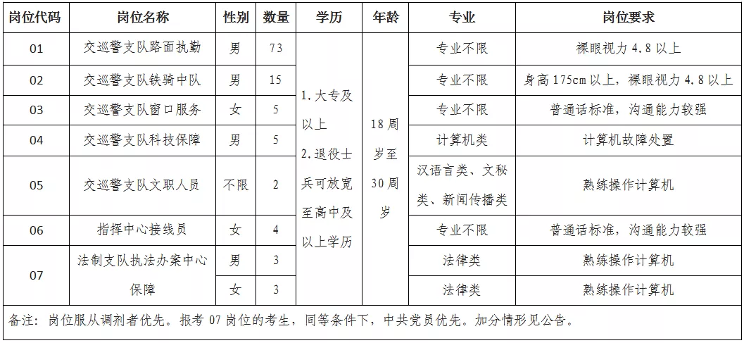 1.本次招聘警务辅助人员,主要岗位分别为交巡警支队从事路面执勤、窗口服务、科技保障岗位和指挥中心接线员、法制支队执法办案中心办案场所保障岗位。