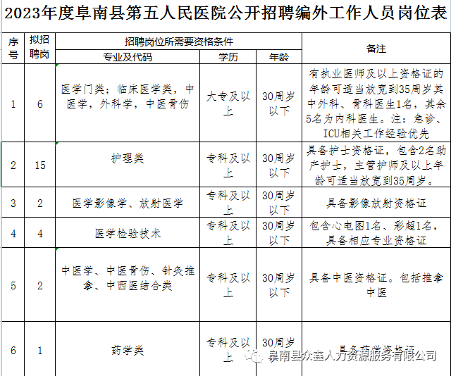 3、具体招聘由阜南县众鑫人力资源公司执行,阜南县第五人民医院(柴集镇中心卫生院)进行审核。