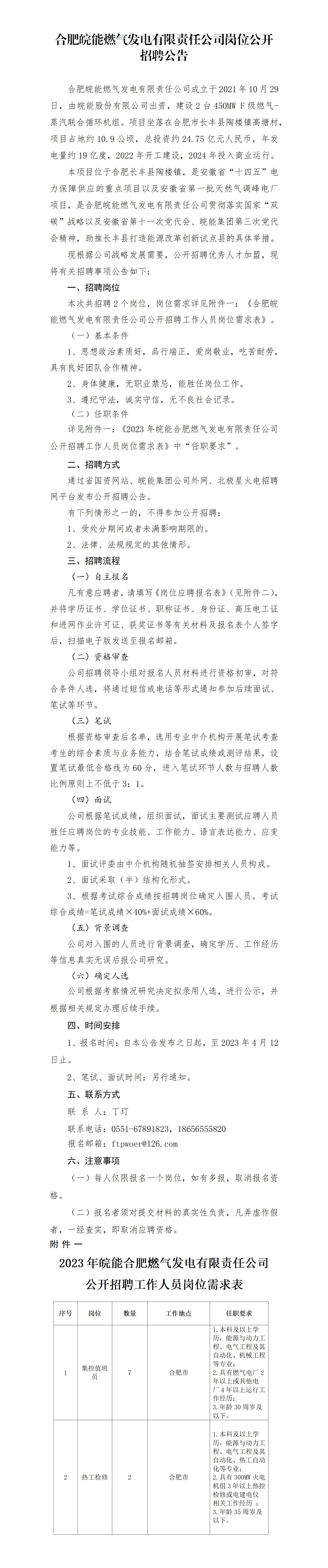 本次共招聘2个岗位,岗位需求详见附件一:《合肥皖能燃气发电有限责任公司公开招聘工作人员岗位需求表》。