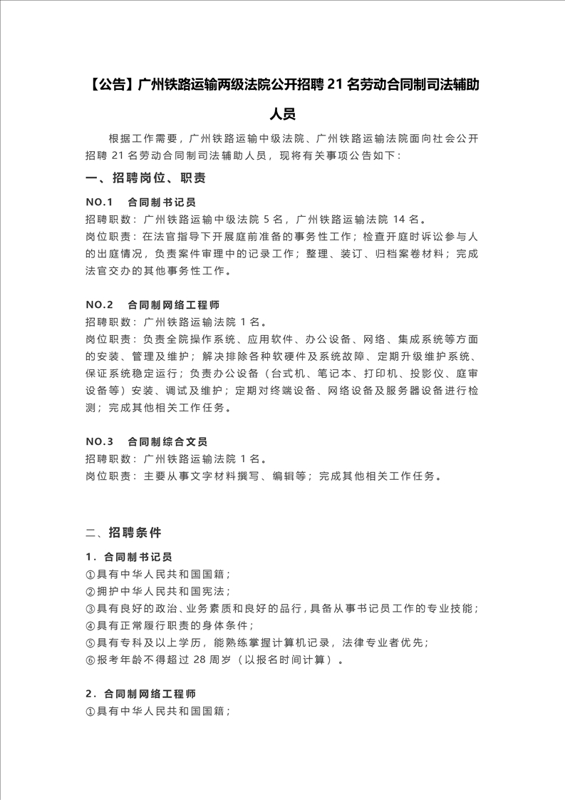 2021年广州铁路运输两级法院公开招聘21名劳动合同制司法辅助人员公告
