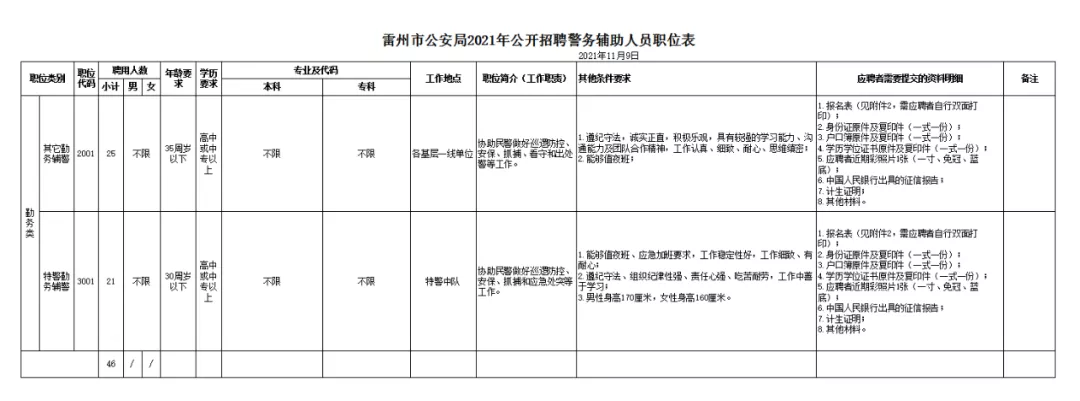 本次共招聘46名警务辅助人员。具体职位表及其他资格条件详见附件1。