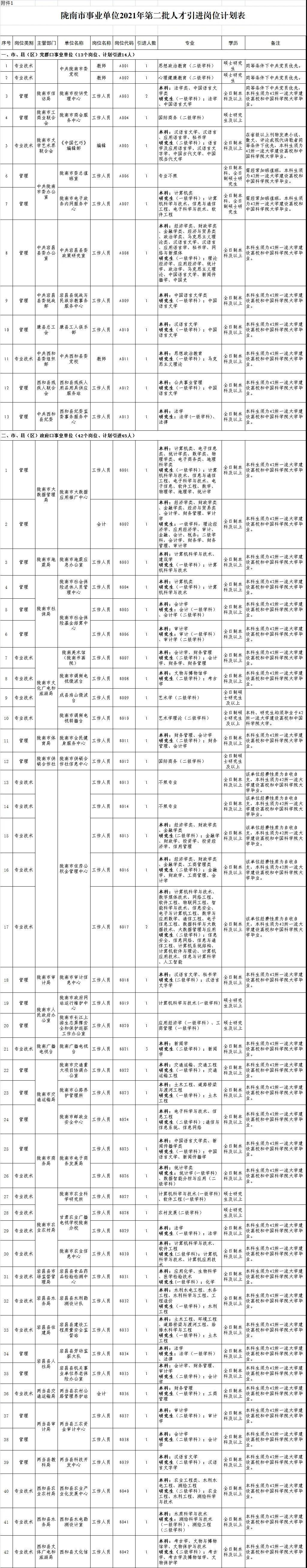 此次陇南市事业单位55个岗位共引进59人,其中:市直事业单位41人,县(区)事业单位18人。按行业划分,党群口事业单位14人,政府口事业单位45人。岗位计划详见附件1。