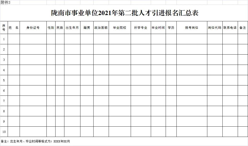 3.报名材料。现场报名人员须持毕业证(含电子注册备案表)、学位证、报到证、身份证原件及复印件,《陇南市事业单位2021年第二批人才引进报名表》(附件2),《陇南市事业单位2021年第二批人才引进报名汇总表》(附件3),近期2寸正面免冠蓝底彩色照片电子版(JPG格式)。除上述材料,留学人员要提供由教育部出具的境外学历、学位认证书及驻外大使馆留学回国人员证明。网上报名人员要建立一个以“报名人员姓名+岗位代码”为名的文件夹,如王XX(A001)。文件夹中包含现场报名人员提交所有材料的彩色扫描件,其中附件2、附件3须提供电子版。