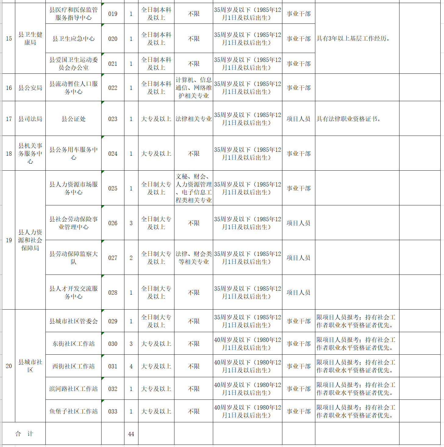 计划为县政府决策咨询服务中心等33个事业单位公开选调工作人员44人(详见附件1)。其中事业干部31人,项目人员13人。