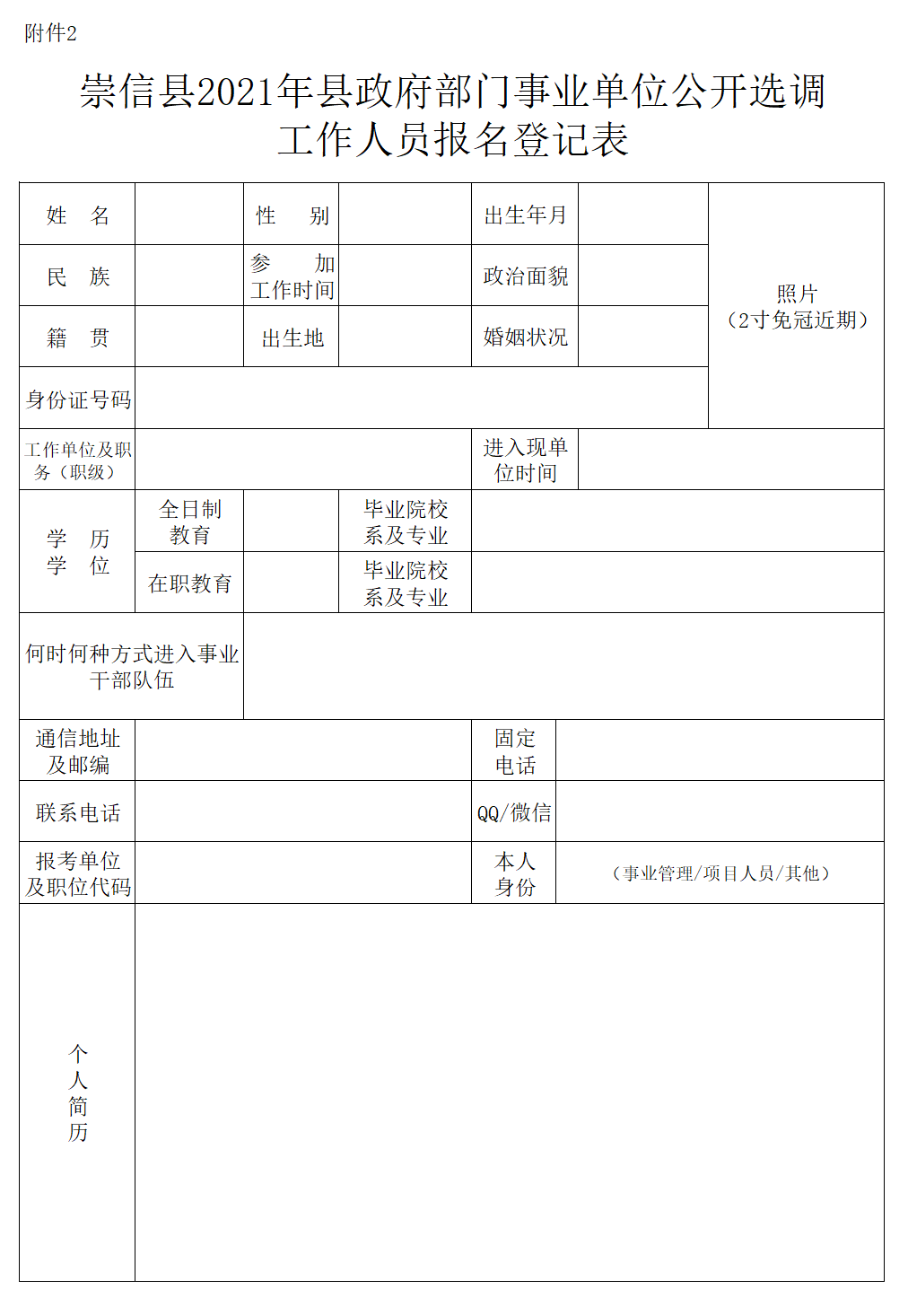 (2)填写《崇信县2021年县政府部门事业单位公开选调工作人员报名登记表》(附件2)。
