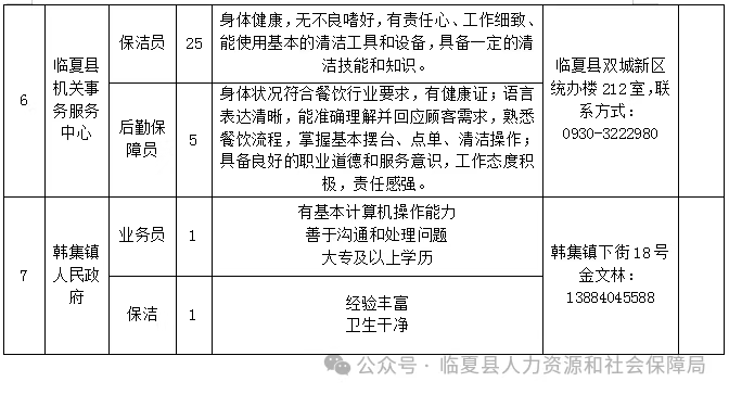 4.联系人:各机关事业单位联系人(详见临夏县公益性岗位需求表)