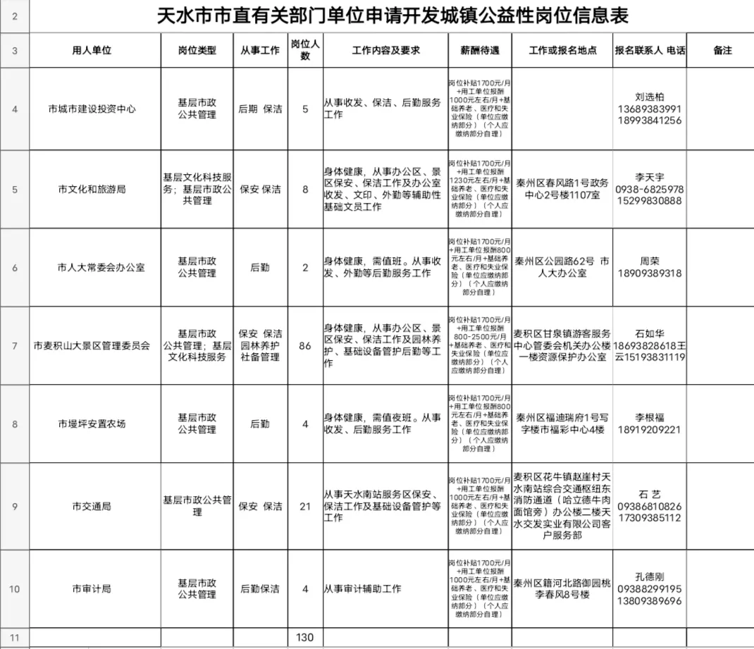2021年天水市本级招聘城镇公益性岗位工作人员公告