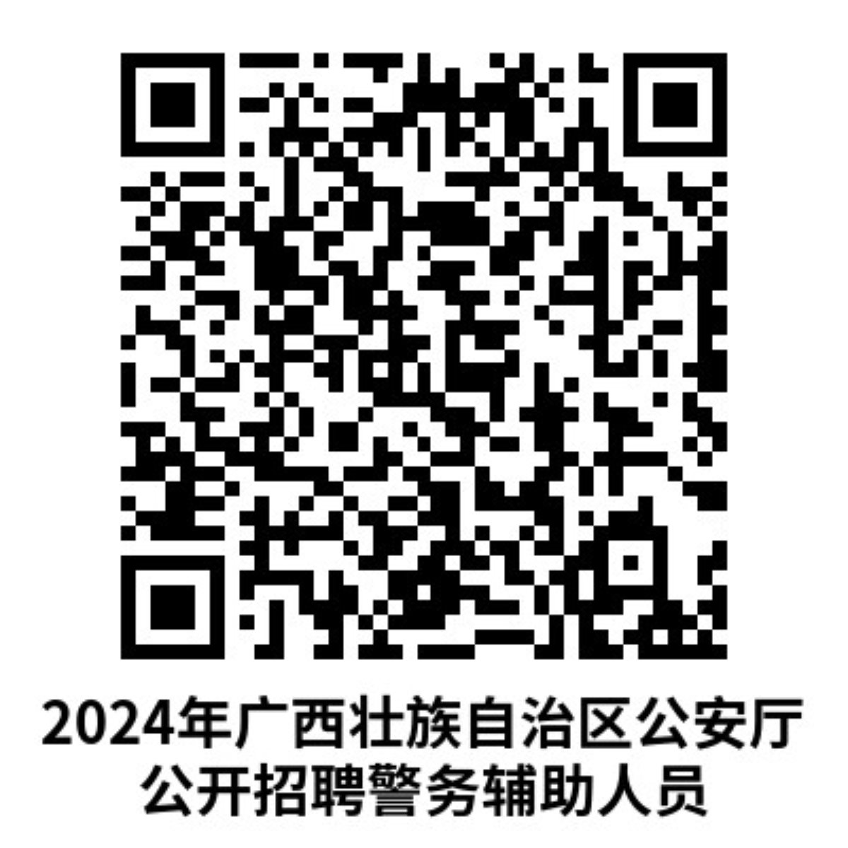 (二)报名方式:网上报名。登录广西壮族自治区公安厅政务网站(gat.gxzf.gov.cn)、广西壮族自治区公安厅微信公众号点击链接或者扫描公告二维码进入“2024年广西壮族自治区公安厅警务辅助人员招聘网上报名系统”(https://gx.bmpta.com/gongantingfj/index.aspx),选择报考岗位、填写个人相关信息资料,上传报名材料完成报名。