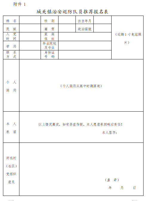 附件1:《城关镇治安巡防队员推荐报名表》