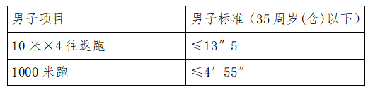 根据面试成绩,按照招聘岗位数1:1.5的比例从高分到低分的顺序确定体能测试人选。具体测试内容及标准如下: