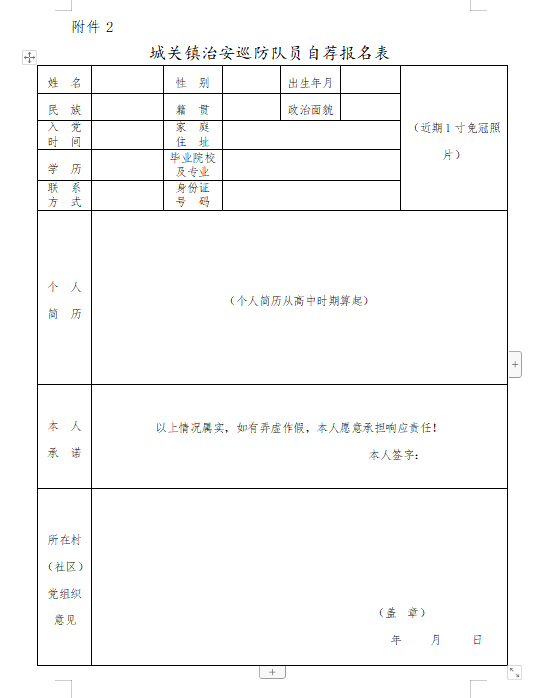 附件2:《城关镇治安巡防队员自荐报名表》