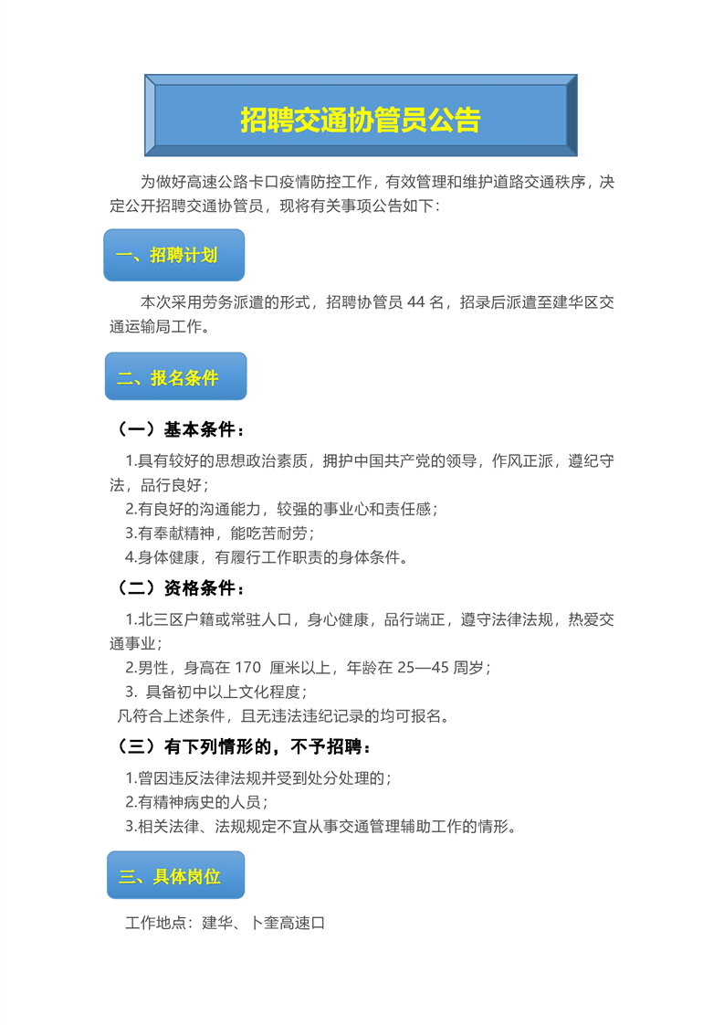 为做好高速公路卡口疫情防控工作,有效管理和维护道路交通秩序,决定公开招聘交通协管员,现将有关事项公告如下: