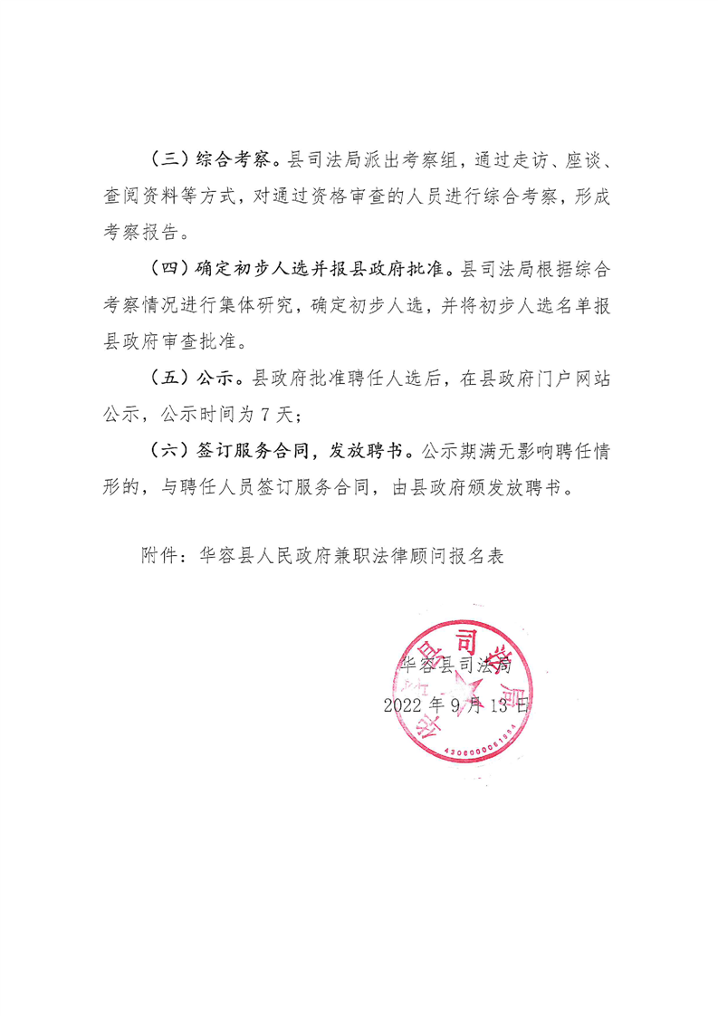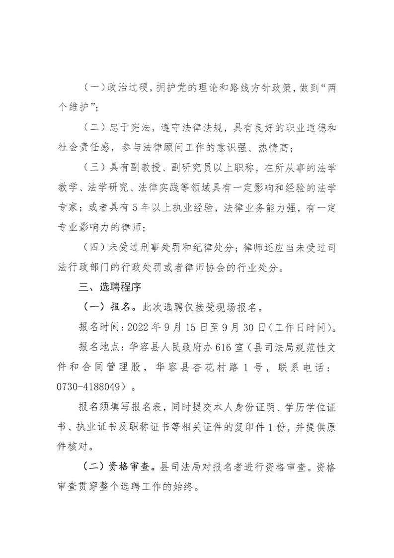 2022-09-14 11:05:00阅读()华容县人民政府华容县司法局关于公开选聘县政府兼职法律顾问公告