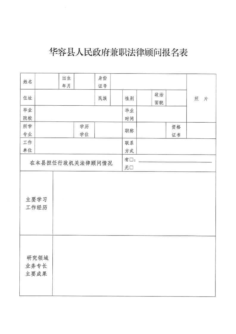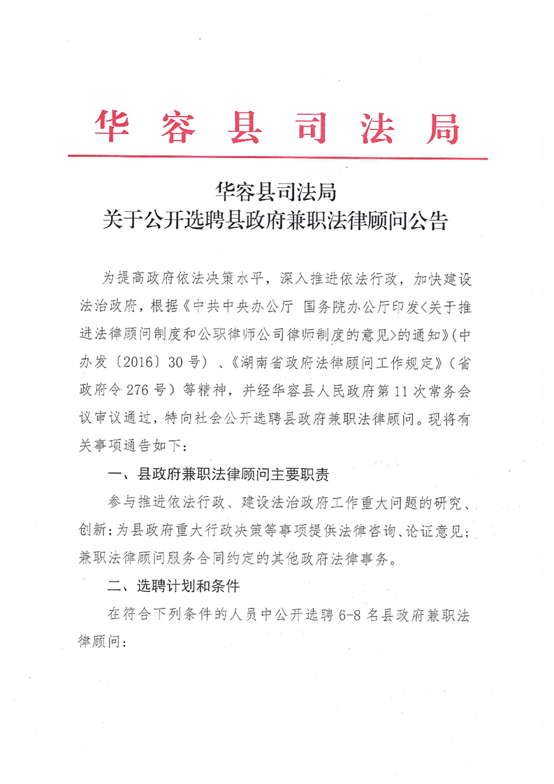 为提高政府依法决策水平,深入推进依法行政,加快建设法治政府,根据《中共中央办公厅国务院办公厅印发<关于推进法律顾问制度和公职律师公司律师制度的意见>的通知》(中办发〔2016〕30 号)、《湖南省政府法律顾问工作规定》(省政府令276号)等精神,并经华容县人民政府第11次常务会议审议通过,特向社会公开选聘县政府兼职法律顾问。现将有关事项通告如下: