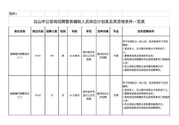 1.白山市公安局招聘警务辅助人员岗位计划表及其资格条件一览表