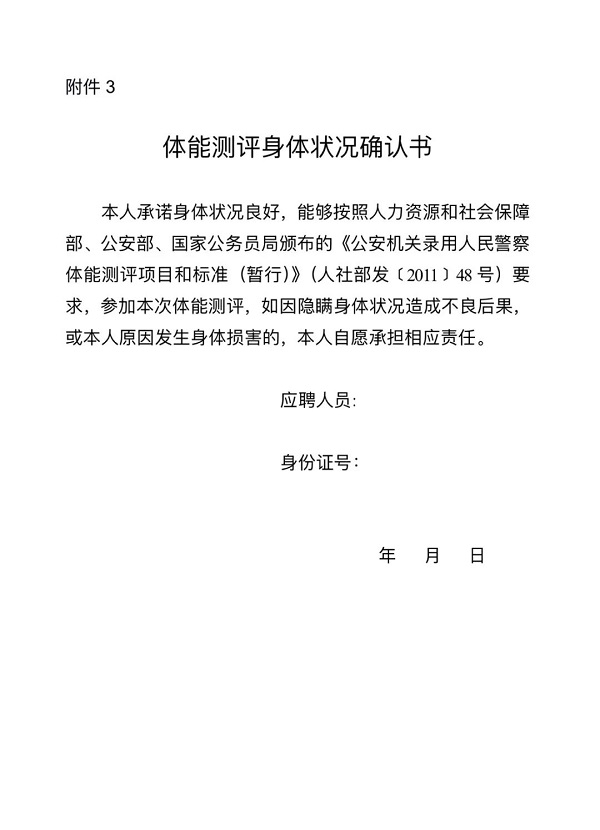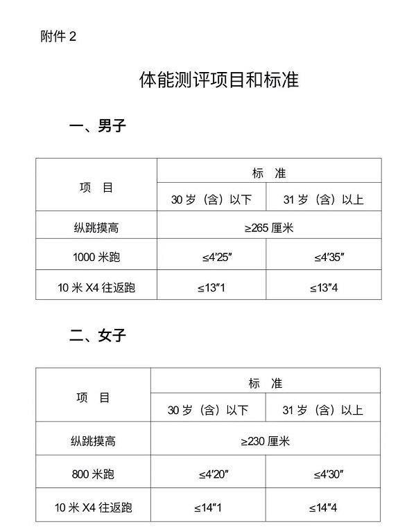 3.体能测评项目和标准:按照《公安机关录用人民警察体能测评项目和标准(暂行)》执行,项目为:10米×4往返跑、纵跳摸高、男子1000米跑/女子800米跑,须三项测试均达标为合格,详见《体能测评项目和标准》(附件2)。不适宜剧烈运动或有隐形疾病的不得参加体能测试,否则后果自负;