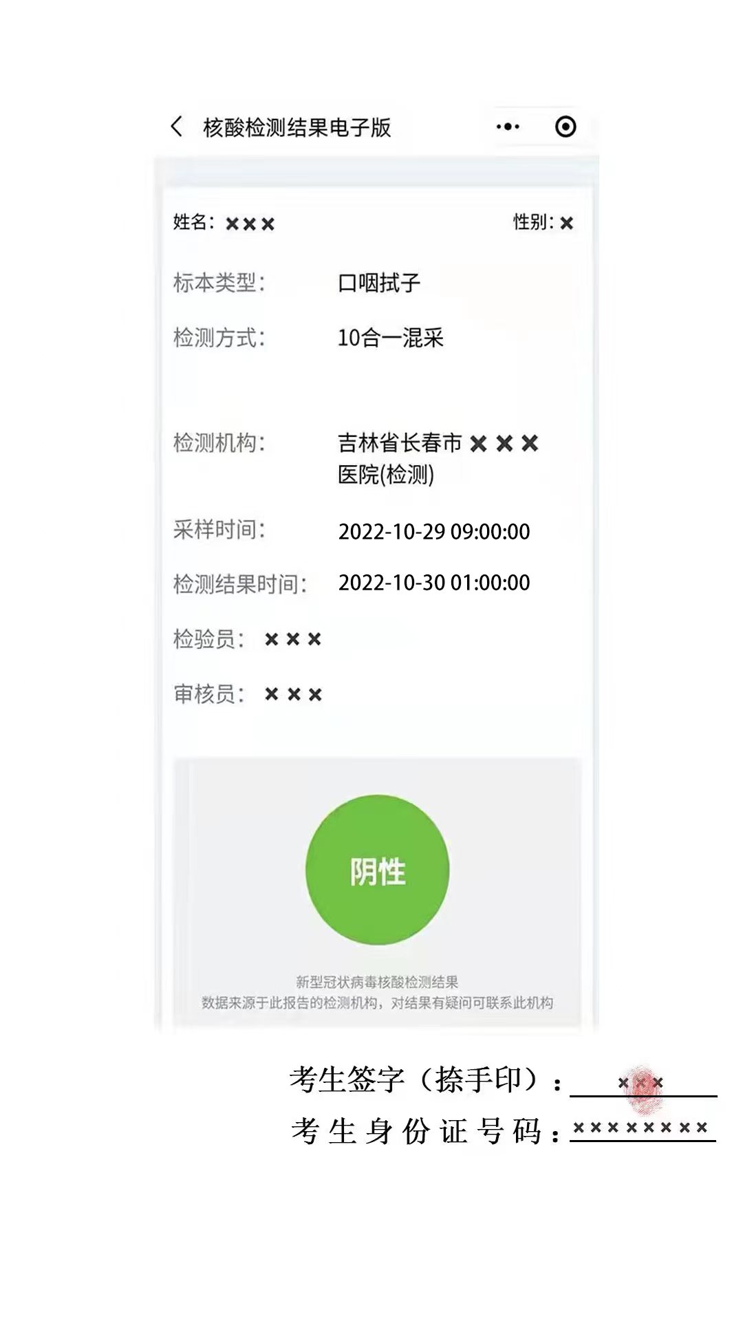 (三)所有应试人员在进入考点时应接受“吉祥码”“通信大数据行程卡”“核酸检测报告”查验及体温测量。考生必须携带入场前24小时内(以采样时间为准)长春市检测机构出具的新冠病毒核酸检测阴性证明参加考试。证明须为长春市有资质的检测机构出具的,能明确显示核酸检测报告时间的纸质报告或打印纸质版的“吉事办”小程序核酸检测结果截图(图例见附件5,需注明姓名、身份证号并由本人签字捺手印)。