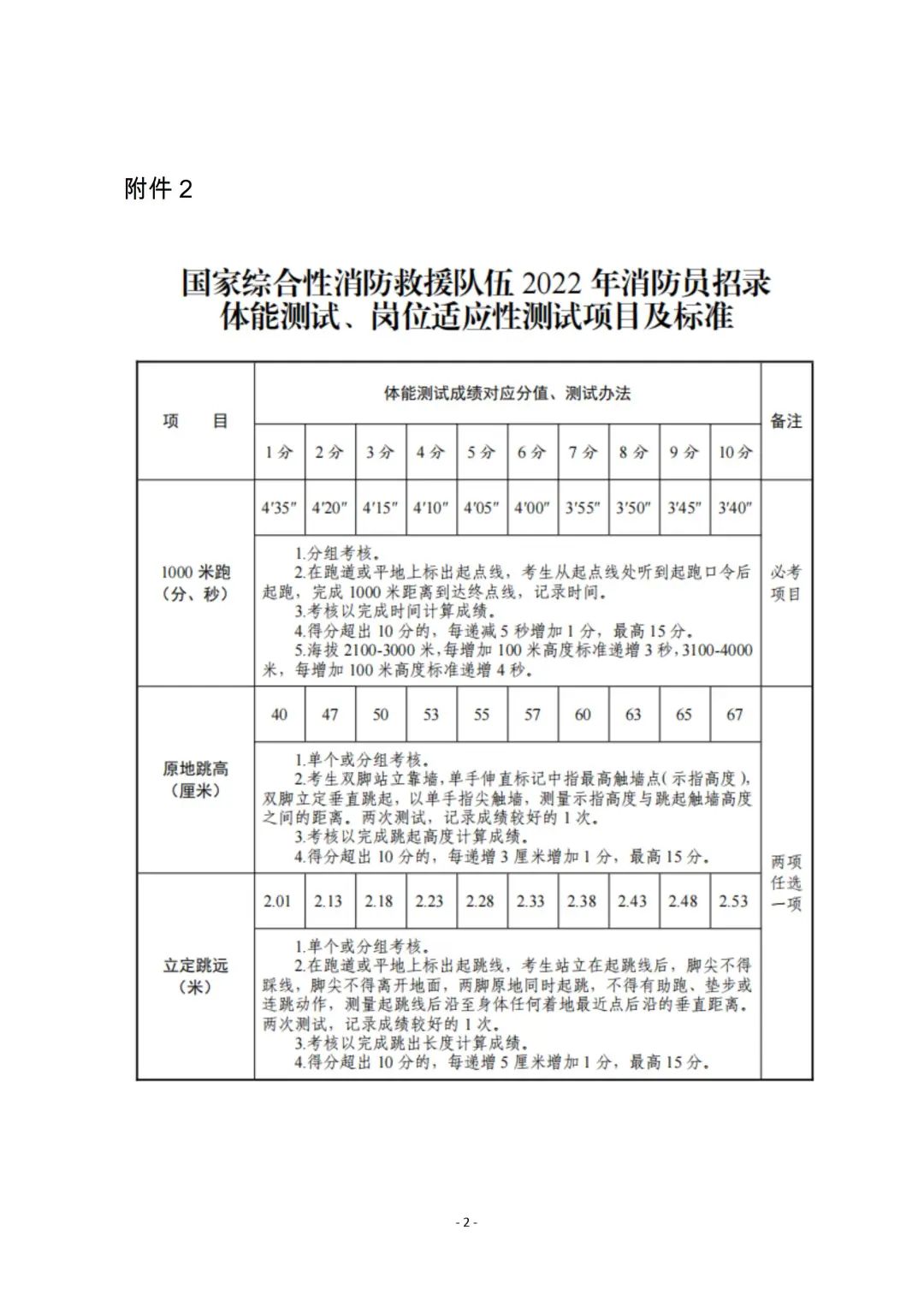 附件2:国家综合性消防救援队伍2022年消防员招录体能测试、岗位适应性测试项目及标准