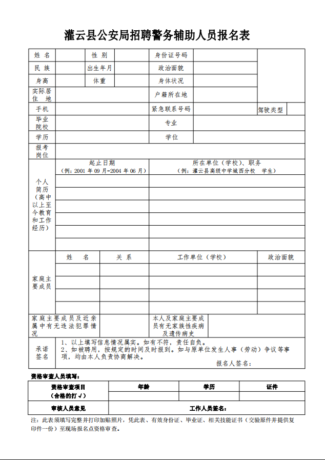 应聘人员须按照应聘岗位要求,真实、准确、完整和规范填写报名表、报考诚信承诺书,连同应聘岗位所需有关证明材料电子版(可以是PDF、JPEG、JPG等形式),发送至邮箱:gygazp@126.com,邮件主题为:“应聘岗位代码+姓名+联系电话”。邮件接收成功后,将于48小时内回复资格初审意见,如未收到资格初审意见,请及时与灌云县公安局联系,联系电话:0518-81868627。