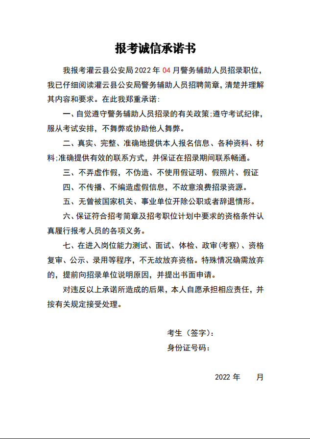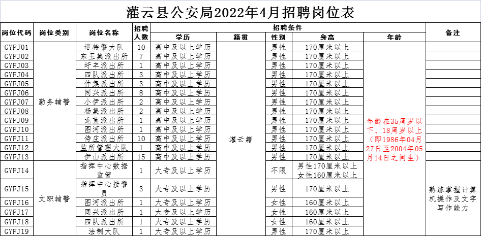 本次所招聘的警务辅助人员,是指为公安机关日常运转和警务活动提供辅助支持的非人民警察身份且非事业编制身份人员。具体岗位及招聘条件等详见《灌云县公安局2022年4月招聘岗位表》,可在灌云县人民政府网(http://www.guanyun.gov.cn/gyxzf/gsgg/gsgg.html)公示公告栏查询。
