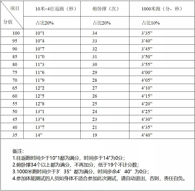 (2)B类考试进行体测和面试。体测项目为为4×10折返跑和立定跳远两个项目(体测标准详见附件五),总成绩按照体测成绩占40%,面试成绩占60%的比例确定。参加体测人数达到1:3比例按照体测成绩从高分到低分顺序确定参加面试人员;体测人数不足1:3比例,按实际人数进入面试。