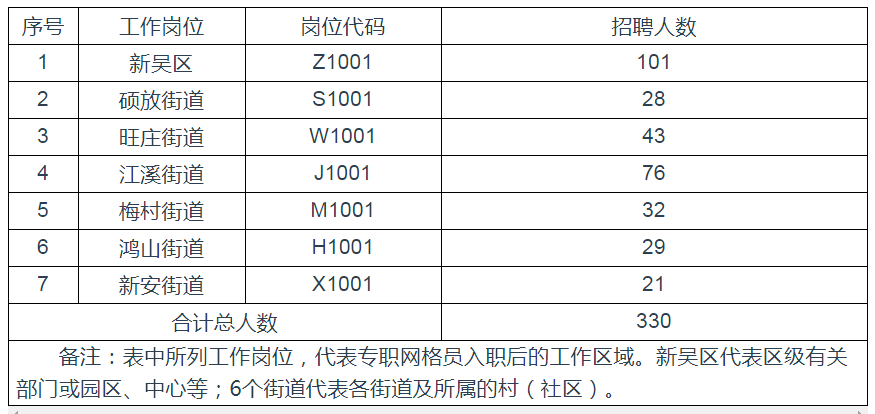 本次招聘专职网格员共330名,具体岗位分配如下: