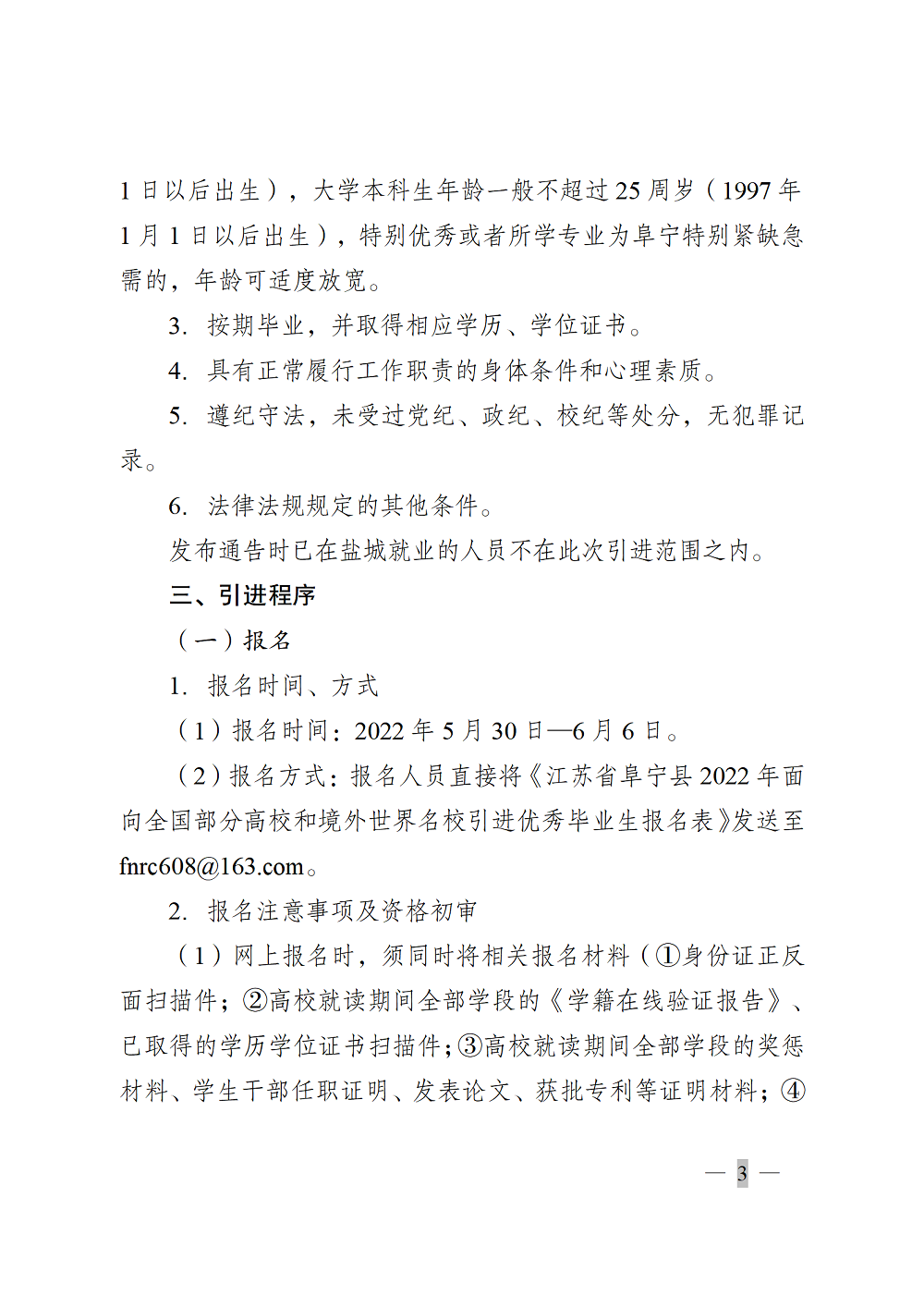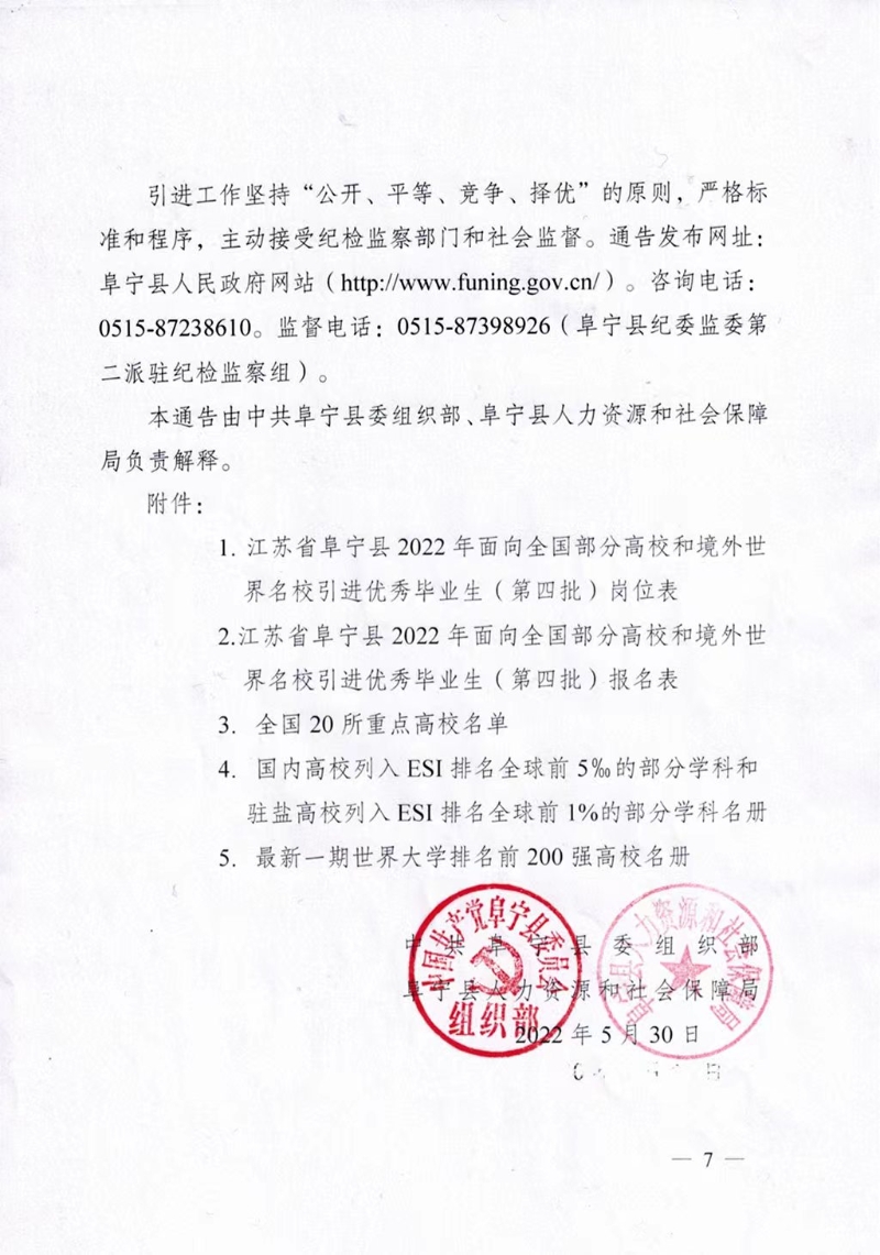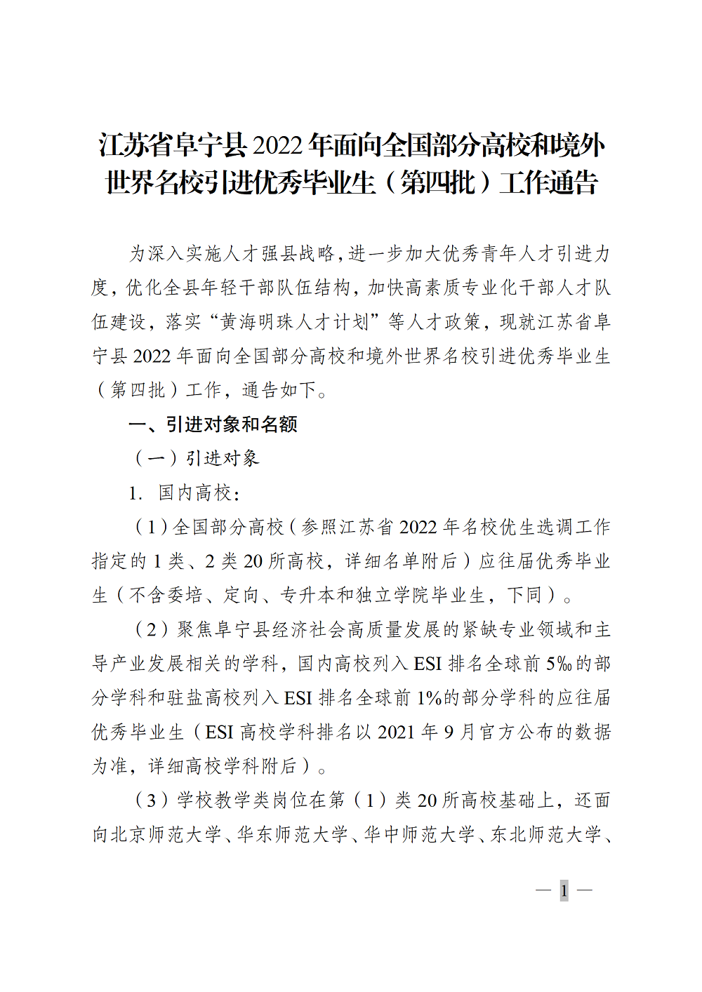 2022年盐城阜宁县面向全国部分高校和境外世界名校引进优秀毕业生(第四批)工作通告