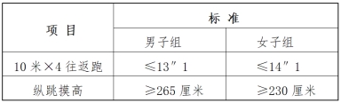 测试方法为:准备测试阶段,受测者双脚自然分开,呈站立姿势。接到指令后,受测者屈腿半蹲,双臂尽力后摆,然后向前上方快速摆臂,双腿同时发力,尽力垂直向上起跳,同时单手举起触摸固定的高度线或高度标识,触摸到高度线或者高度标识的视为合格。测试不超过三次。