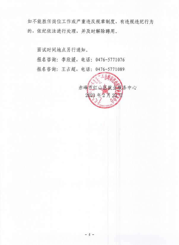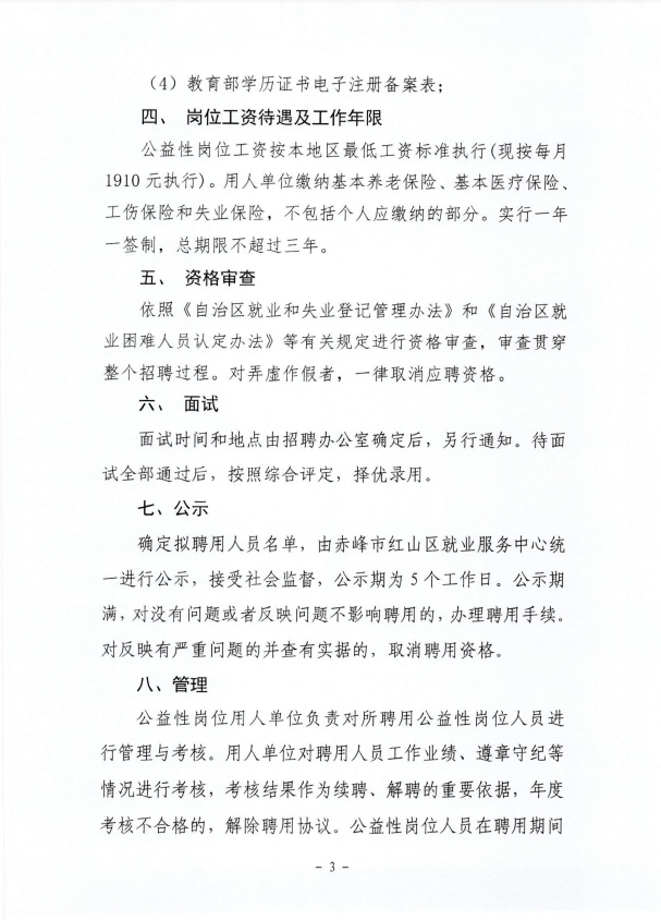 确定拟聘用人员名单,由赤峰市红山区就业服务中心统一进行公示,接受社会监督,公示期为5个工作日。公示期满,对没有问题或者反映问题不影响聘用的,办理聘用手续。对反映有严重问题的并查有实据的,取消聘用资格。