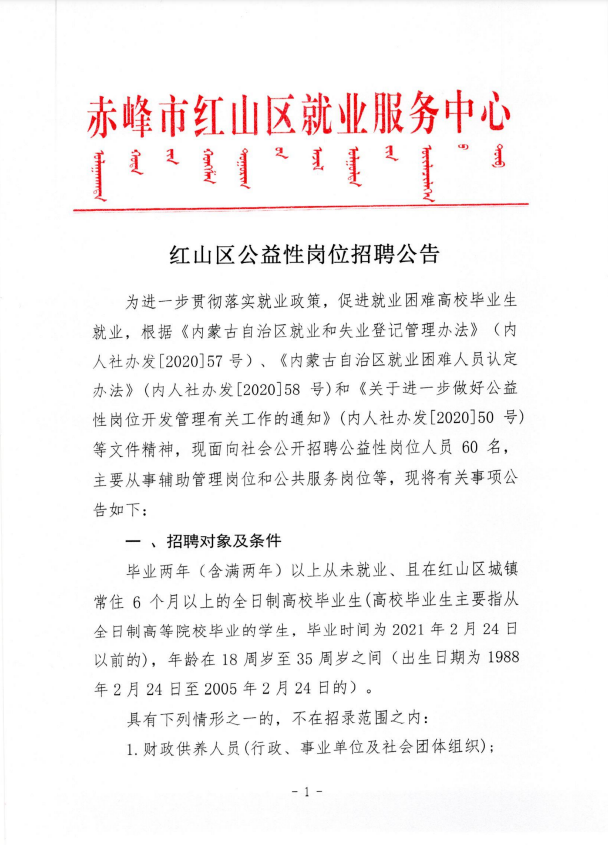 2023-02-28 14:38:43阅读()赤峰公共招聘网为进一步贯彻落实就业政策,促进就业困难高校毕业生就业,根据《内蒙古自治区就业和失业登记管理办法》(内人社办发[2020]57号)、《内蒙古自治区就业困难人员认定办法》(内人社办发[2020]58号)和《关于进一步做好公益性岗位开发管理有关工作的通知》(内人社办发[2020]50号)等文件精神,现面向社会公开招聘公益性岗位人员60 名,主要从事辅助管理岗位和公共服务岗位等,现将有关事项公告如下: