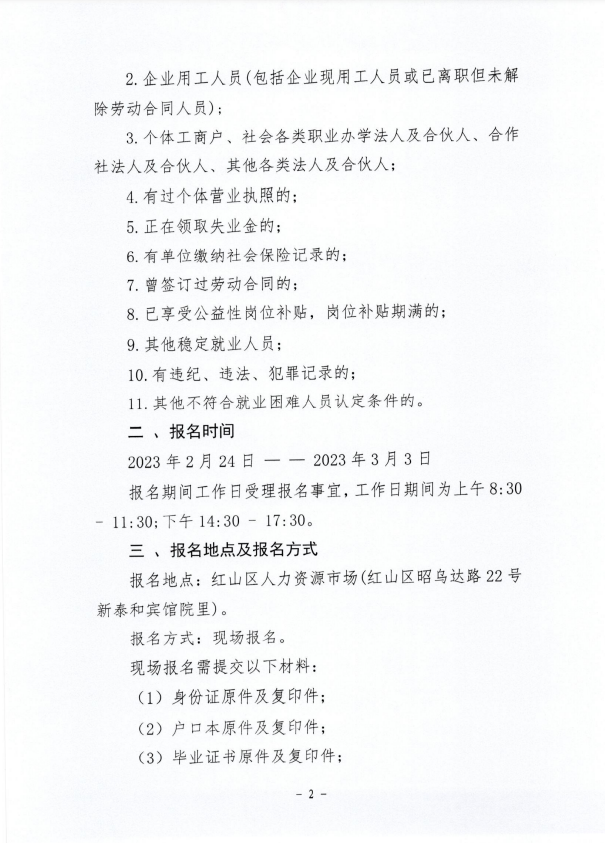 毕业两年(含满两年)以上从未就业、且在红山区城镇常住6个月以上的全日制高校毕业生(高校毕业生主要指从全日制高等院校毕业的学生,毕业时间为2021年2月24日以前的),年龄在18周岁至35周岁之间(出生日期为1988年2月24日至2005年2月24日的)。