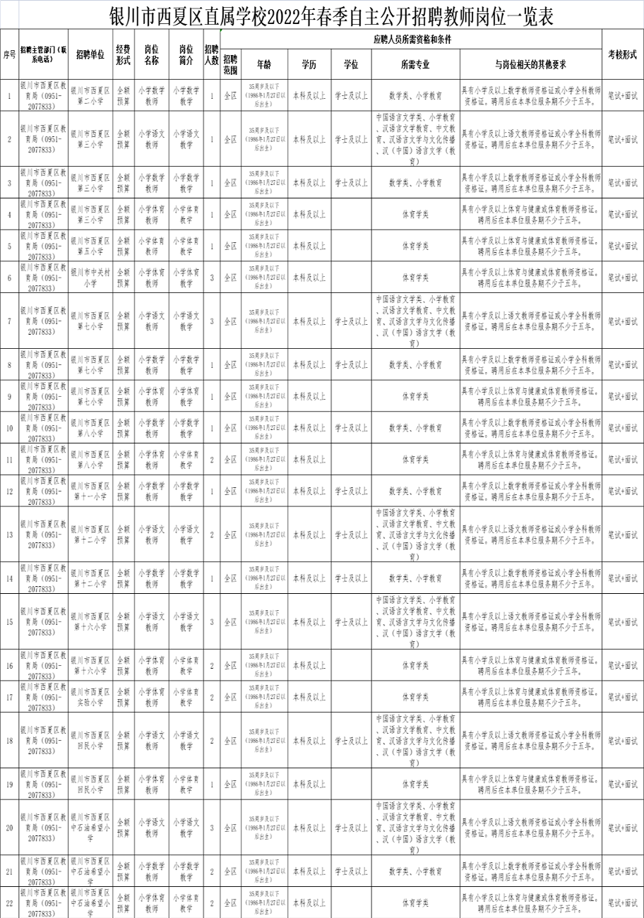本次招聘22个岗位、37人(小学语文教师14人、小学数学教师8人、小学体育教师15人),具体招聘岗位、资格条件及有关事项详见附件《银川市西夏区直属学校2022年春季自主公开招聘教师岗位一览表》。