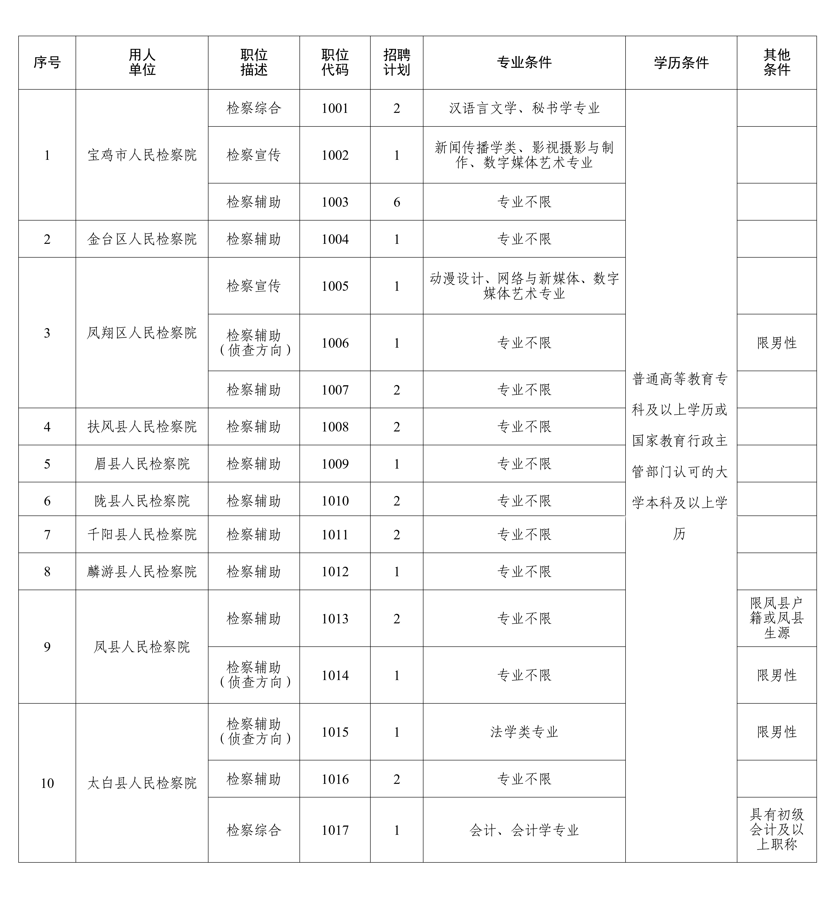 2025-06-04 08:32:08阅读()宝鸡市人民检察院根据工作需要及相关政策规定,结合工作实际,经陕西省人民检察院批准,宝鸡市检察机关2025年面向社会公开招聘聘用制书记员29名。现将有关事项公告如下: