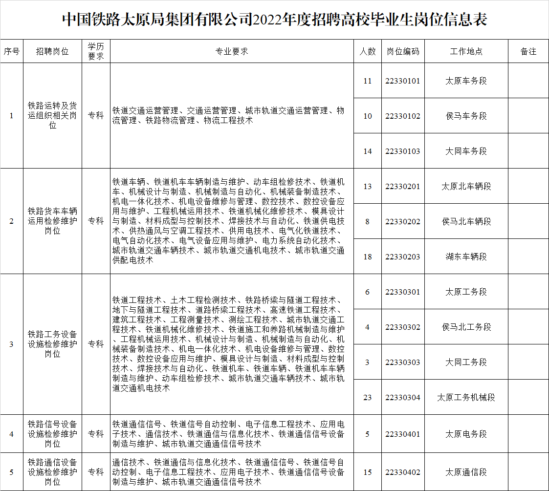 招聘岗位、学历、专业、人数和工作单位等内容详见《中国铁路太原局集团有限公司2022年度招聘高校毕业生岗位信息表》。