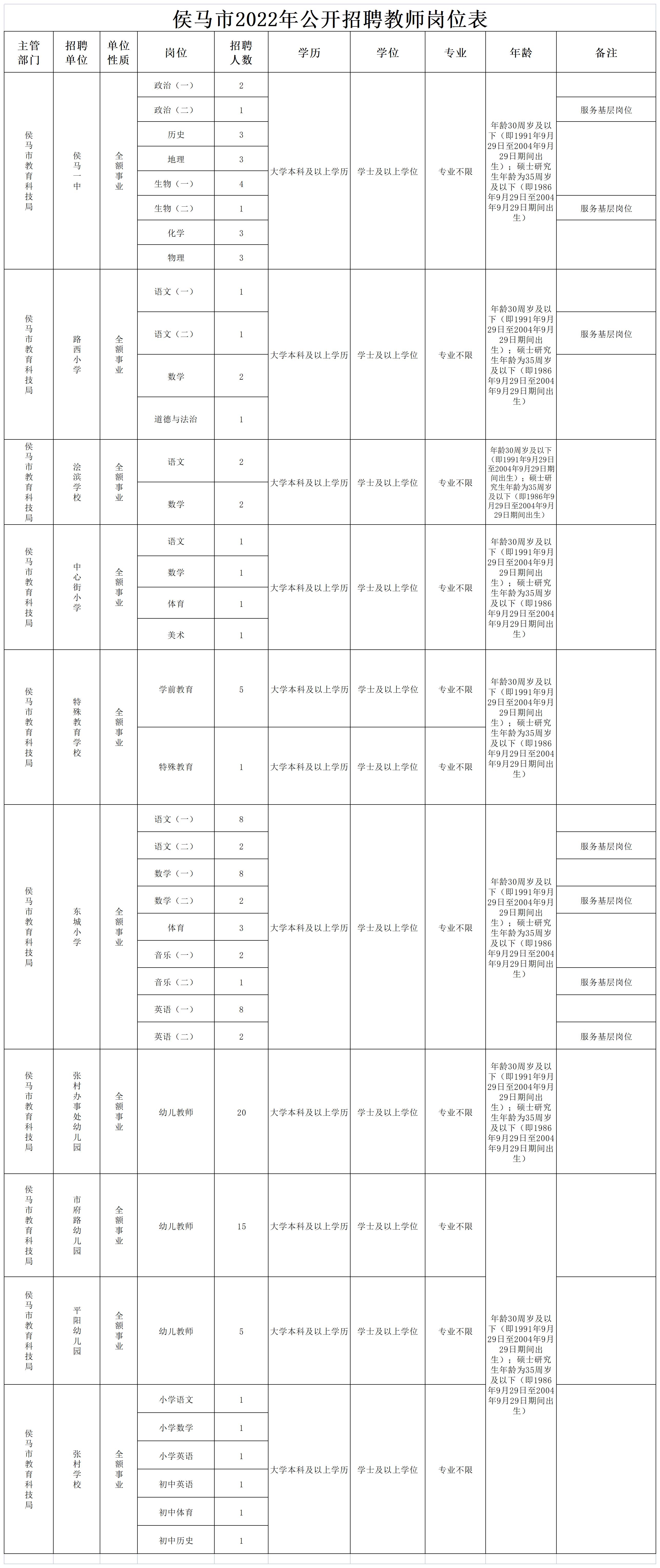 侯马市2022年公开招聘中小学、幼儿园教师121名。各招聘岗位所需的具体条件以《侯马市2022年公开招聘教师岗位表》(见附件,以下简称《岗位表》)的要求为准。