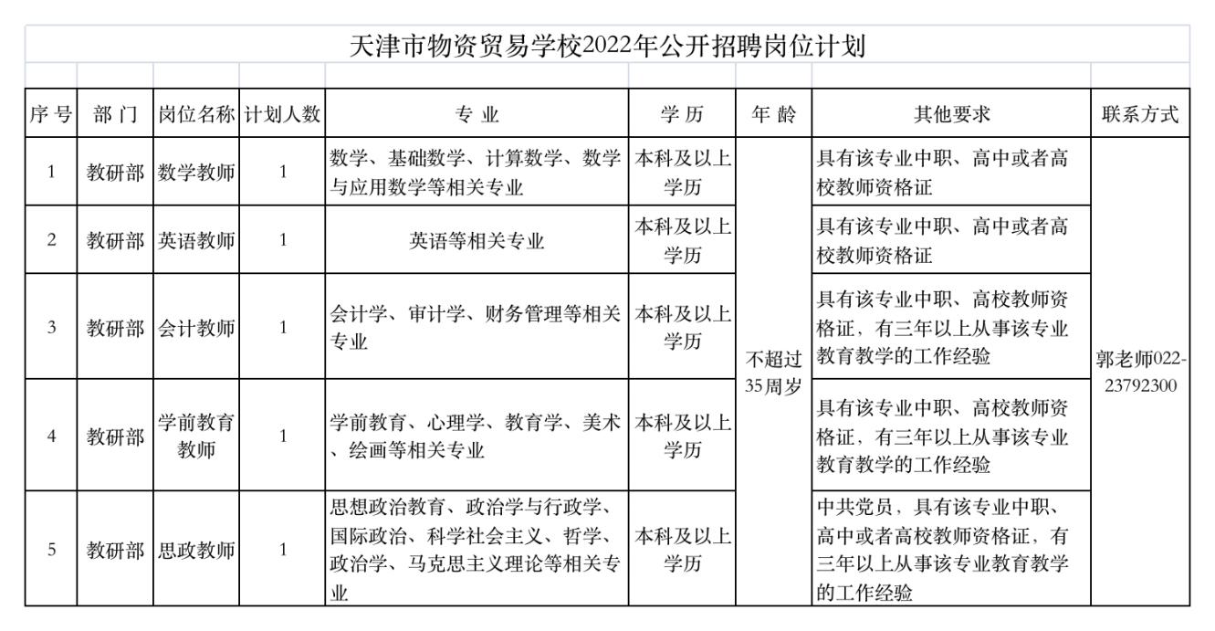 具体招聘岗位见《天津市物资贸易学校2022年公开招聘岗位计划》。