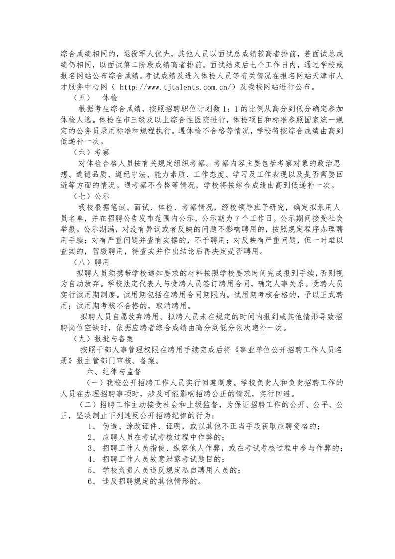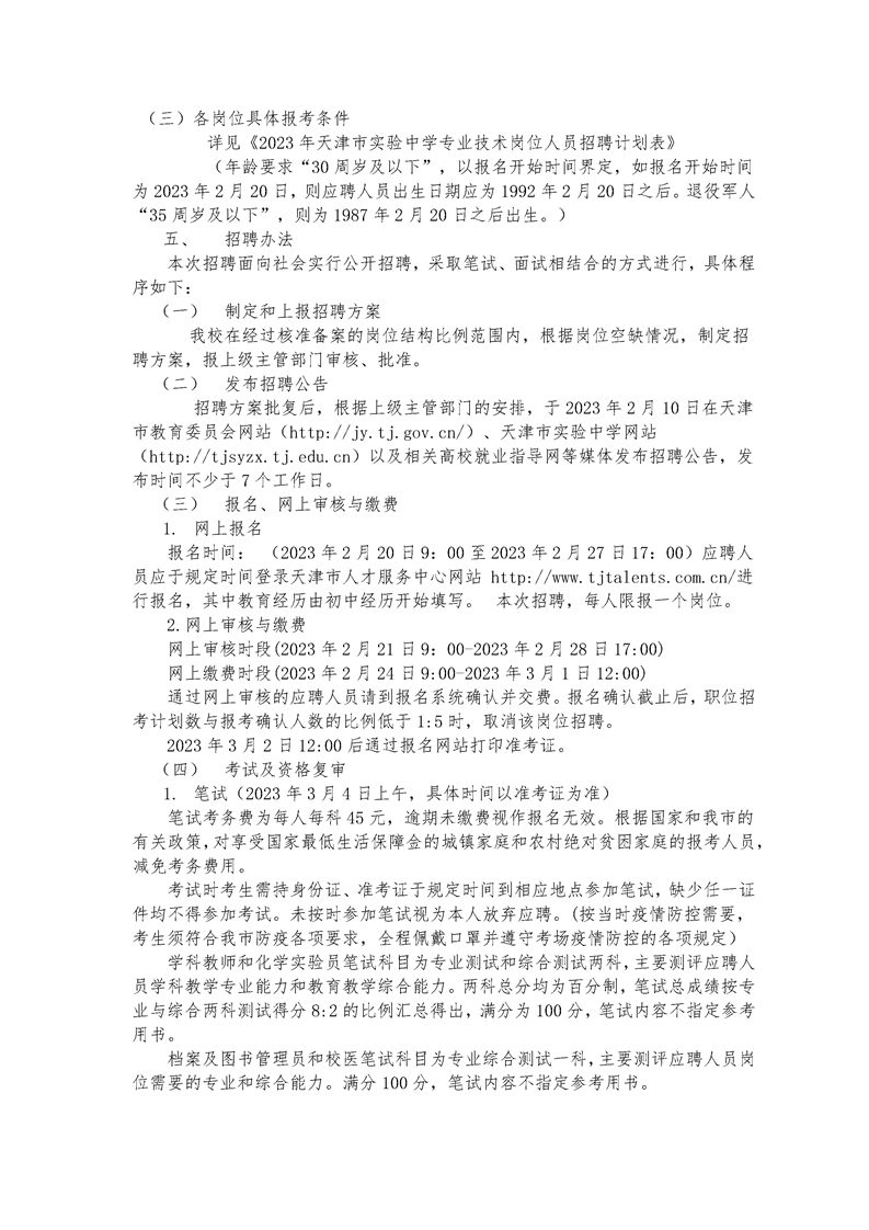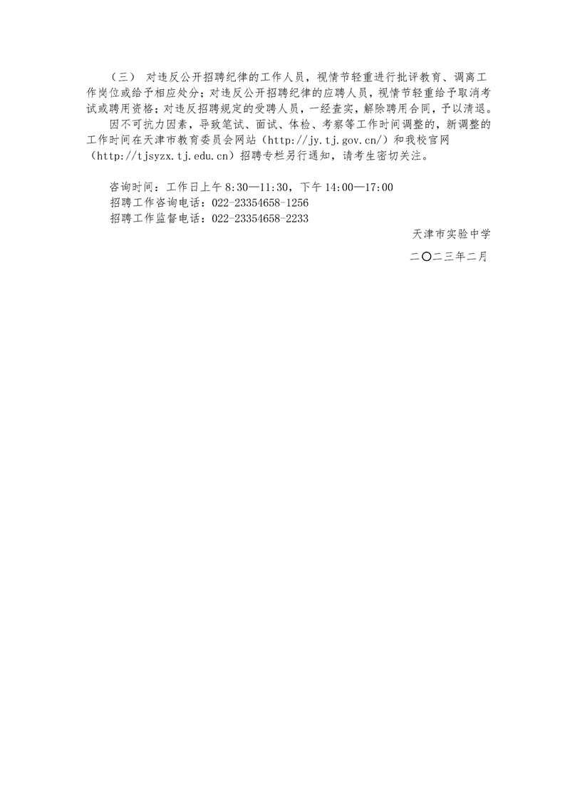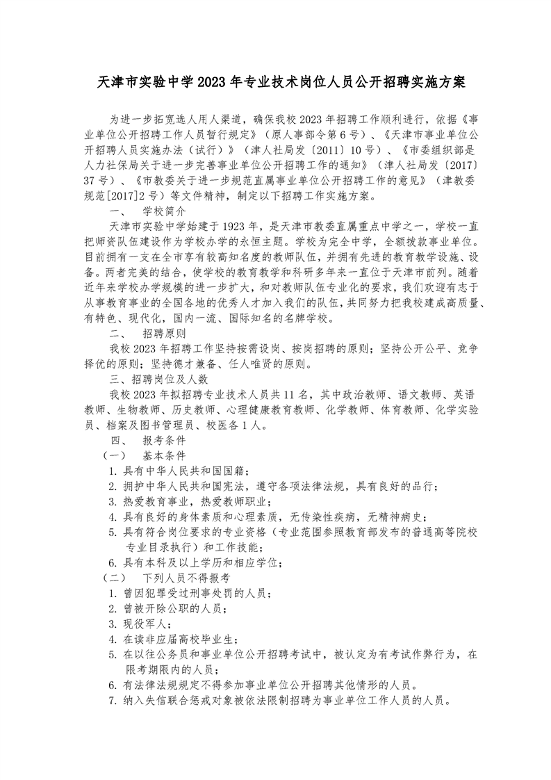 2023-02-11 16:34:25阅读()天津市实验中学为进一步拓宽选人用人渠道,确保我校 2023 年招聘工作顺利进行,依据《事业单位公开招聘工作人员暂行规定》(原人事部令第 6 号)、《天津市事业单位公开招聘人员实施办法(试行)》 津人社局发 (2011) 10 号)、《市委组织部是人力社保局关于进一步完善事业单位公开招聘工作的通知》 (津人社局发 (2017)37 号)、《市教委关于进一步规范直属事业单位公开招聘工作的意见》 (津教委规范[2017]2 号)等文件精神,制定以下招聘工作实施方案。
