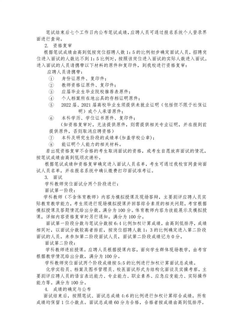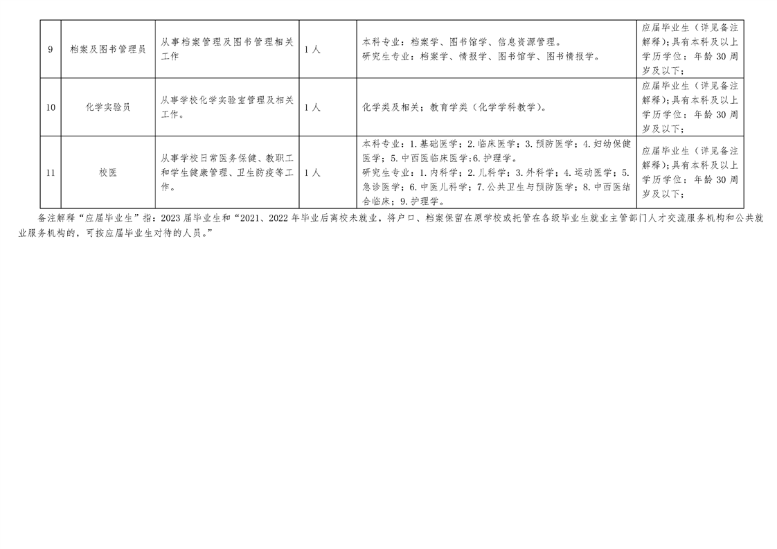 三、招聘岗位及人数我校 2023 年拟招聘专业技术人员共 11 名,其中政治教师、语文教师、英语教师、生物教师、历史教师、心理健康教育教师、化学教师、体育教师、化学实验员、档案及图书管理员、校医各 1人。