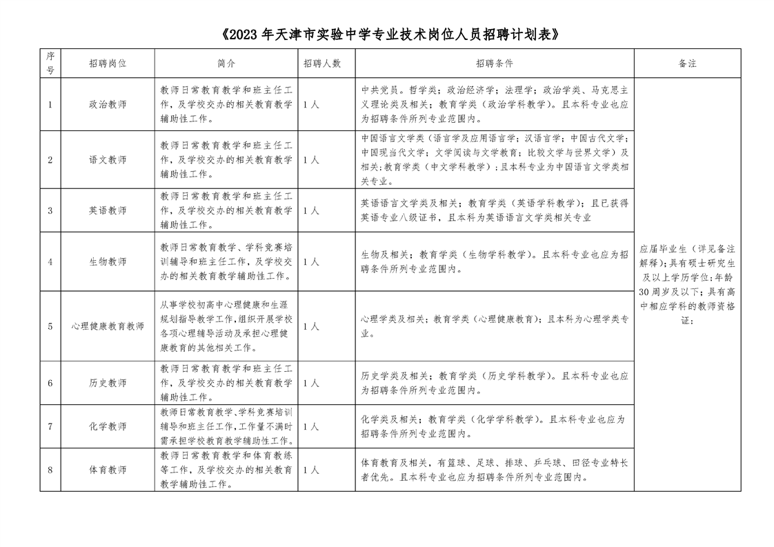 2023年天津市实验中学专业技术岗位人员公开招聘实施方案