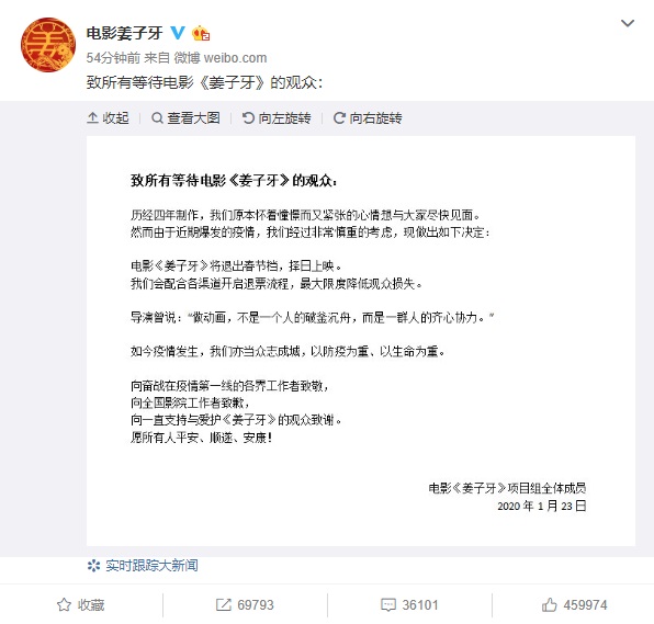 《姜子牙》等两部电影官宣因疫情退出春节档