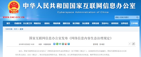 2020-03-02 15:32:29阅读()国家互联网信息办公室由国家互联网信息办公室发布的《网络信息内容生态治理规定》(以下简称《规定》)已于昨日(3月1日)起施行,旨在营造良好网络生态,保障公民、法人和其他组织的合法权益,维护国家安全和公共利益。