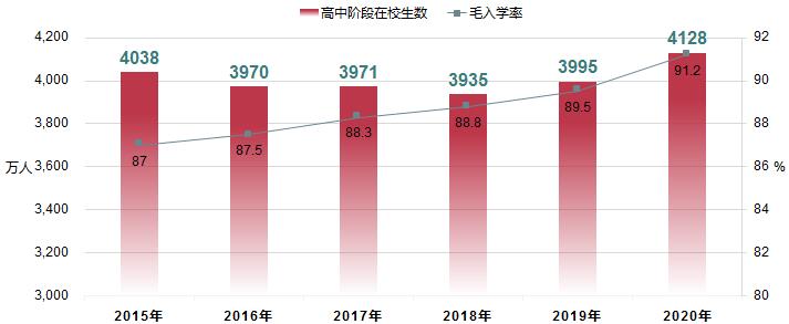 2020年,全国高中阶段共有学校2.44万所。招生1504.00万人,在校生4127.80万人。高中阶段毛入学率91.2%。