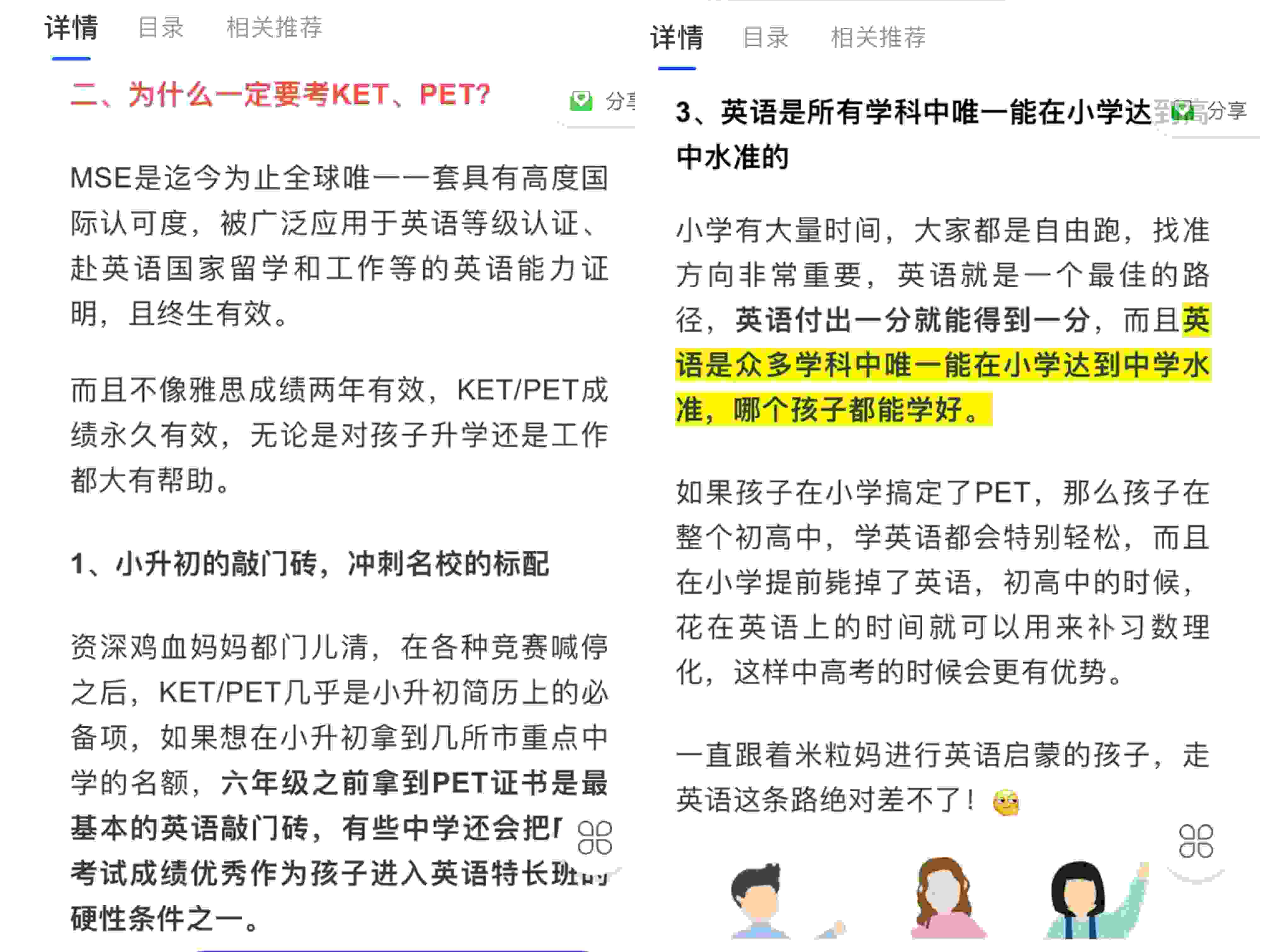 在课程详情中,KET和PET考试却被称作“小升初的敲门砖,冲刺名校的标配”,甚至提到,“英语是众多学科中唯一能在小学达到中学水准,哪个孩子都能学好”,直指“超前教育”。列表显示,有2409人花费349元开通了KET课程;PET课程售价399元,已有795人开通。