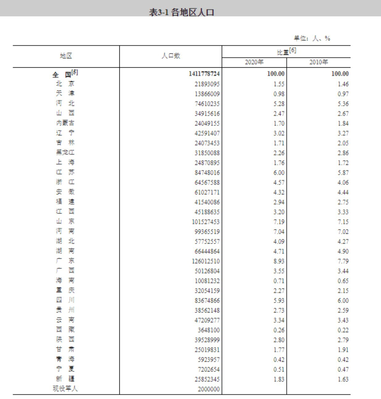 31个省份中,人口超过1亿人的省份有2个,在5000万人至1亿人之间的省份有9个,在1000万人至5000万人之间的省份有17个,少于1000万人的省份有3个。其中,人口居前五位的省份合计人口占全国人口[3]比重为35.09%。分区域看,东部地区人口为563717119人,占39.93%;中部地区人口为364694362人,占25.83%;西部地区人口为382852295人,占27.12%;东北地区人口为98514948人,占6.98%。