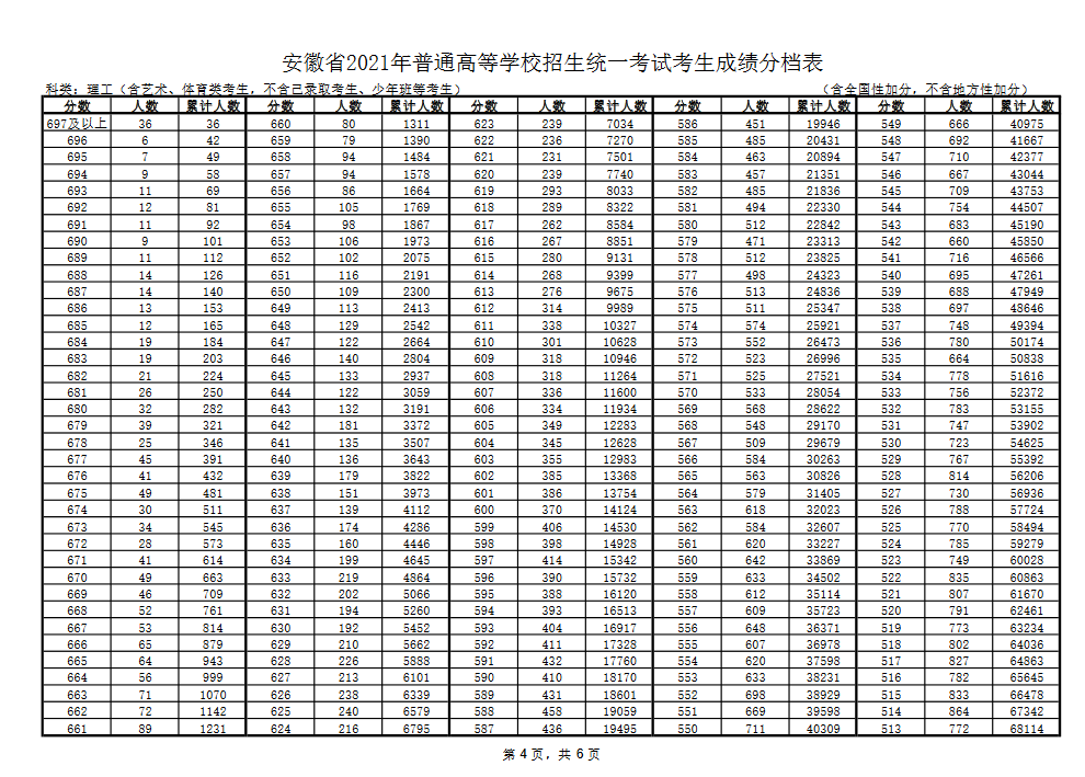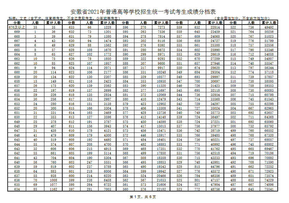 2021-06-23 22:35:41阅读()互联网安徽省2021年普通高等学校招生统一考试考生成绩分档表公布,文科670分及以上,35人;理科697分及以上,36人。