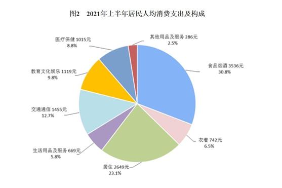 钱都花在哪儿了?中新经纬记者梳理发现,上半年,全国居民人均消费支出中,食品烟酒消费人均花销最大,达3536元;占比最高,为30.8%。此外,居住费用也是人均消费的一项重要支出,上半年人均居住消费支出2649元,占人均消费支出的比重为23.1%,人均消费支出占比仅次于食品烟酒。