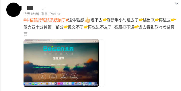 中信银行校招笔试系统崩了上热搜,网友晒出北森致歉