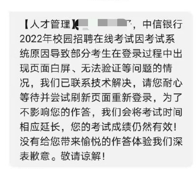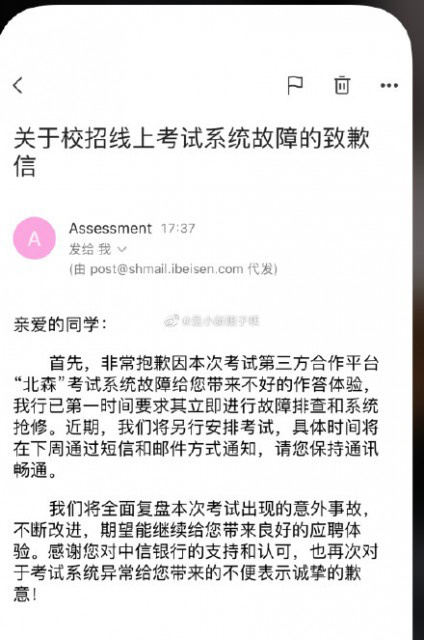 也有网友晒出了收到的中信银行校招线上考试系统提供方北森发来的致歉信。